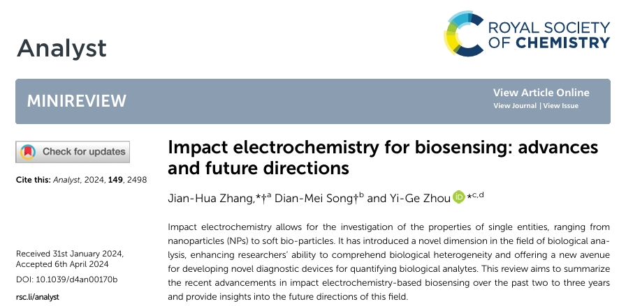 Congratulations to Jianhua Zhang, PhD students (Alumni) of Zhou group respectively, for her review article “Impact electrochemistry for biosensing: Advances and future directions.” being accepted by the Analyst.(https://doi.org/10.1039/D4AN00170B)