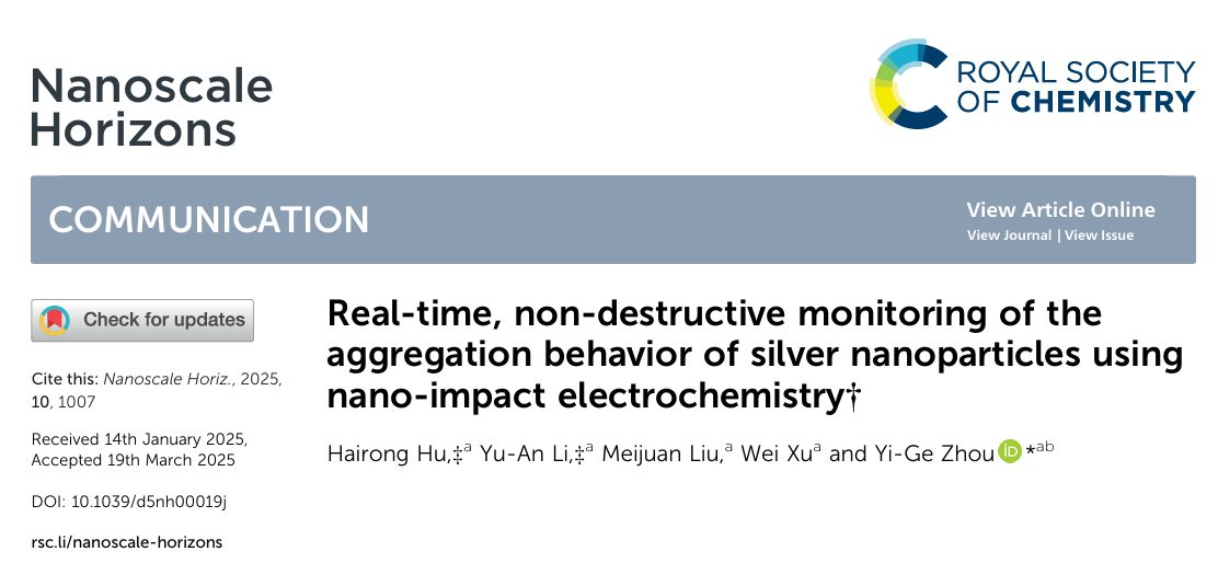 Congratulations to Hairong Hu (MSc student) and Yu-An Li (PhD student), for their research article “Real-time, non-destructive monitoring of the aggregation behavior of silver nanoparticles using nano-impact electrochemistry” being accepted by the Nanoscale Horizons.(https://doi.org/10.1039/D5NH00019J)